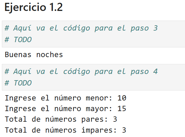 datetimecon un alias diferente adt, cree un objeto fecha/hora y acceda a los datos de la hora. A continuación, cree un control de flujo que, con base en el objeto creado, salude al usuario con buenos días, buenas tardes o buenas noches, de acuerdo a la hora del objeto. - Cree un programa que solicite al usuario dos números enteros y cuente los números pares e impares que hay entre ellos, ambos números inclusive. Al finalizar el ciclo, se deben imprimir los resultados