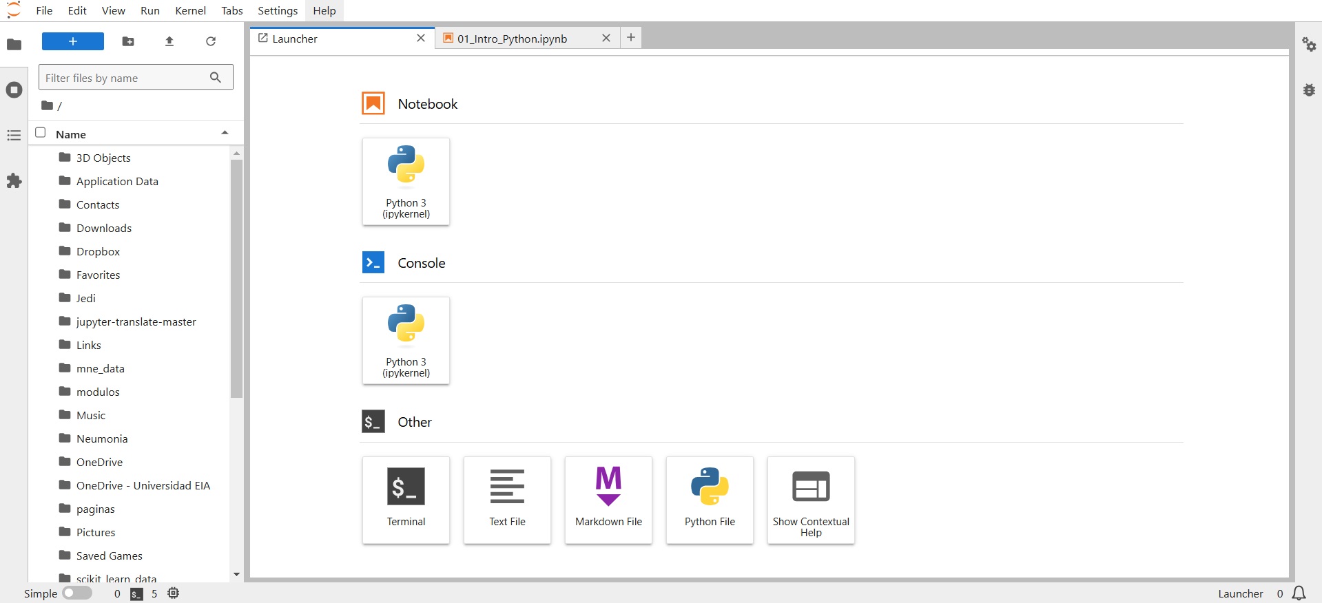 Jupyter notebook es una plataforma interactiva donde se puede escribir código y texto y realizar visualizaciones. Puede acceder a Jupyter Notebook desde Anaconda Navigator o abrir directamente la aplicación (no recomendado). Debería abrirse automáticamente en su navegador predeterminado. La siguiente figura muestra un Notebook abierto con Google Chrome, usando la interfaz JupyerLab.