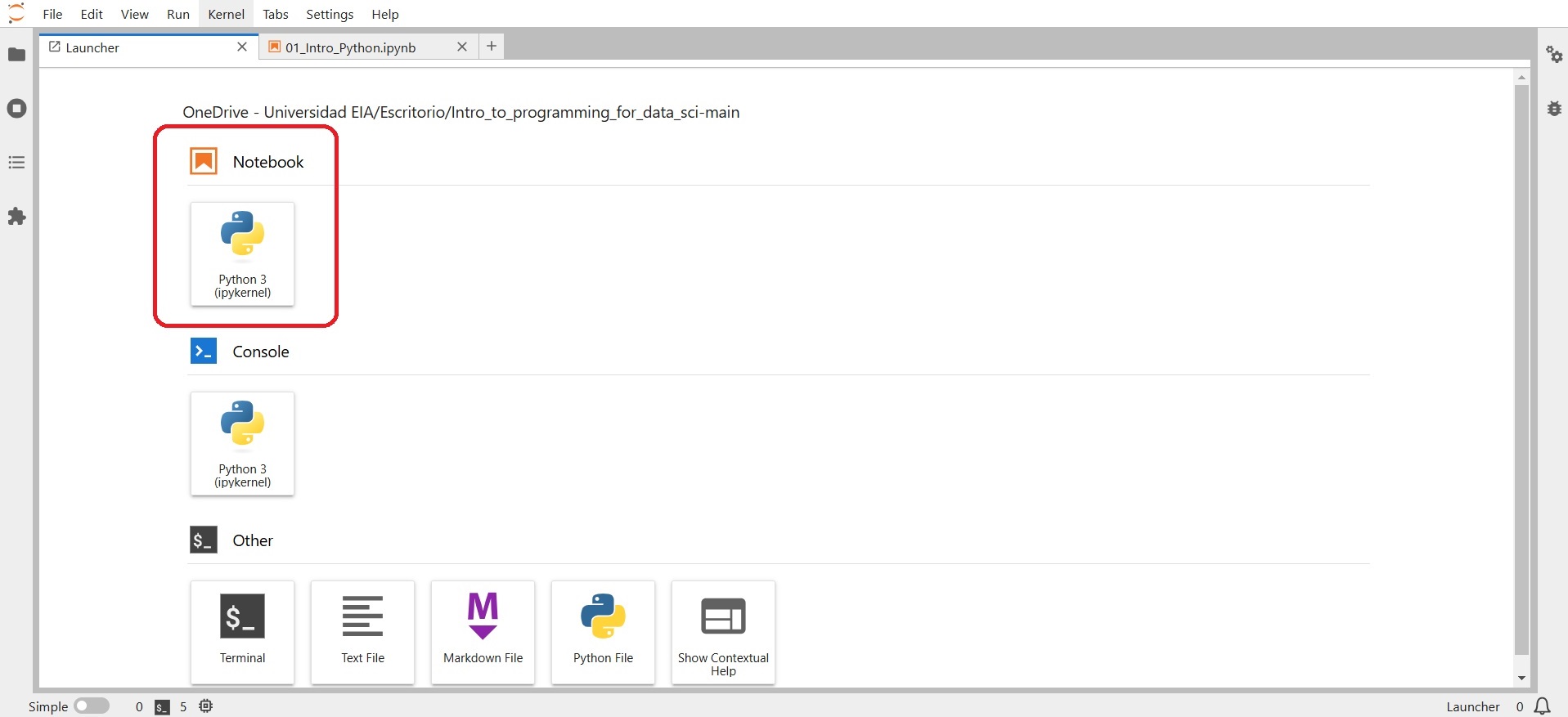 Para crear un nuevo Notebook, haga clic en el botón Python 3 (ipykernel), como se muestra en la figura.